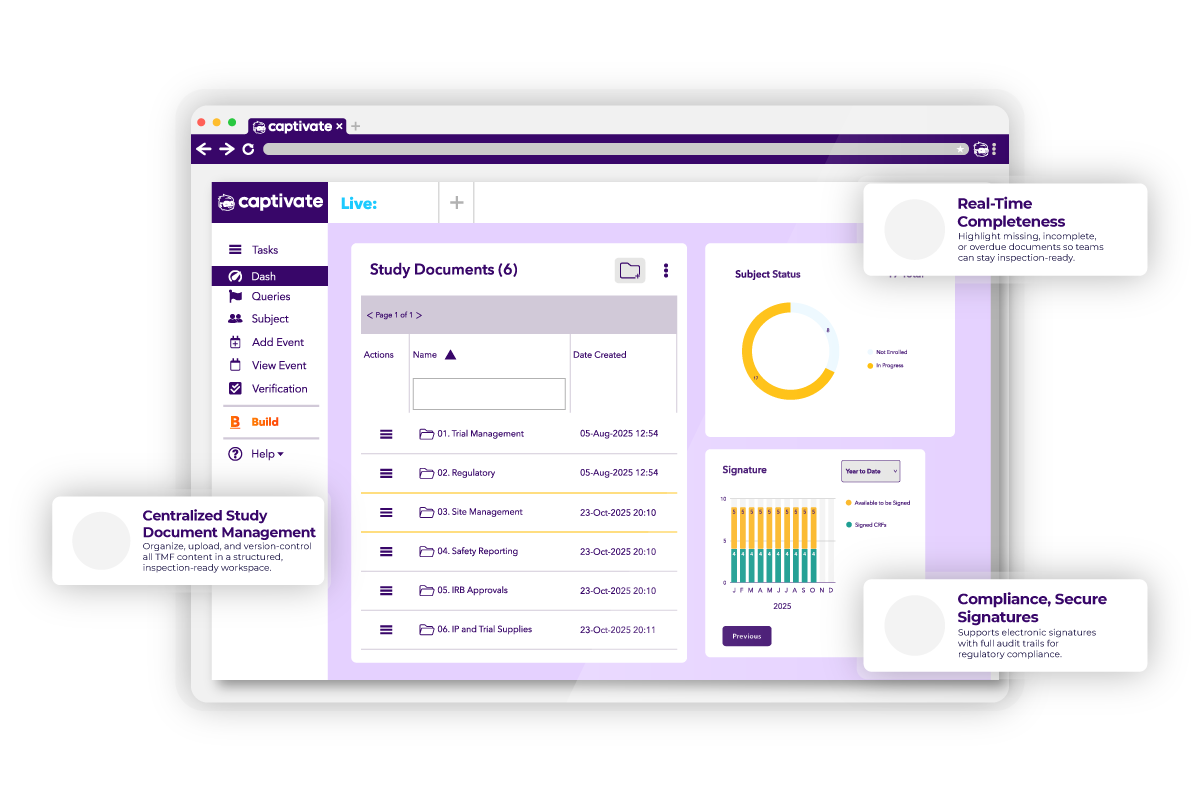 Captivate eTMF (Electronic Trial Master File) is designed to help studies and sponsors efficiently organize and manage clinical trial documentation, ensuring smooth submissions at the conclusion of the data collection cycle. Built on the robust Captivate platform, it simplifies the complexities of trial documentation while maintaining the highest standards of privacy, security, and scalability.