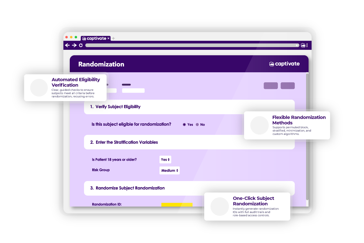 By integrating randomization into Captivate EDC, you enhance your ability to make the process faster, easier, and truly unbiased. Fully integrates with data collection for straightforward setup.