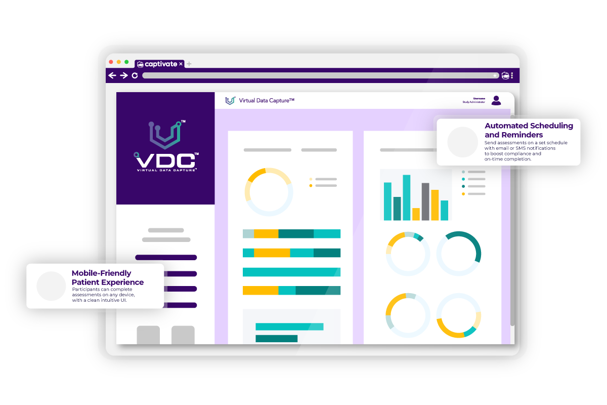 VDC electronic Patient Reported Outcomes (ePRO) captures patient health status data and integrates responses into Captivate EDC. Enable collection of patient-reported health information through surveys addressing pain intensity, visual analog scales, psychological symptoms, and quality-of-life measures.